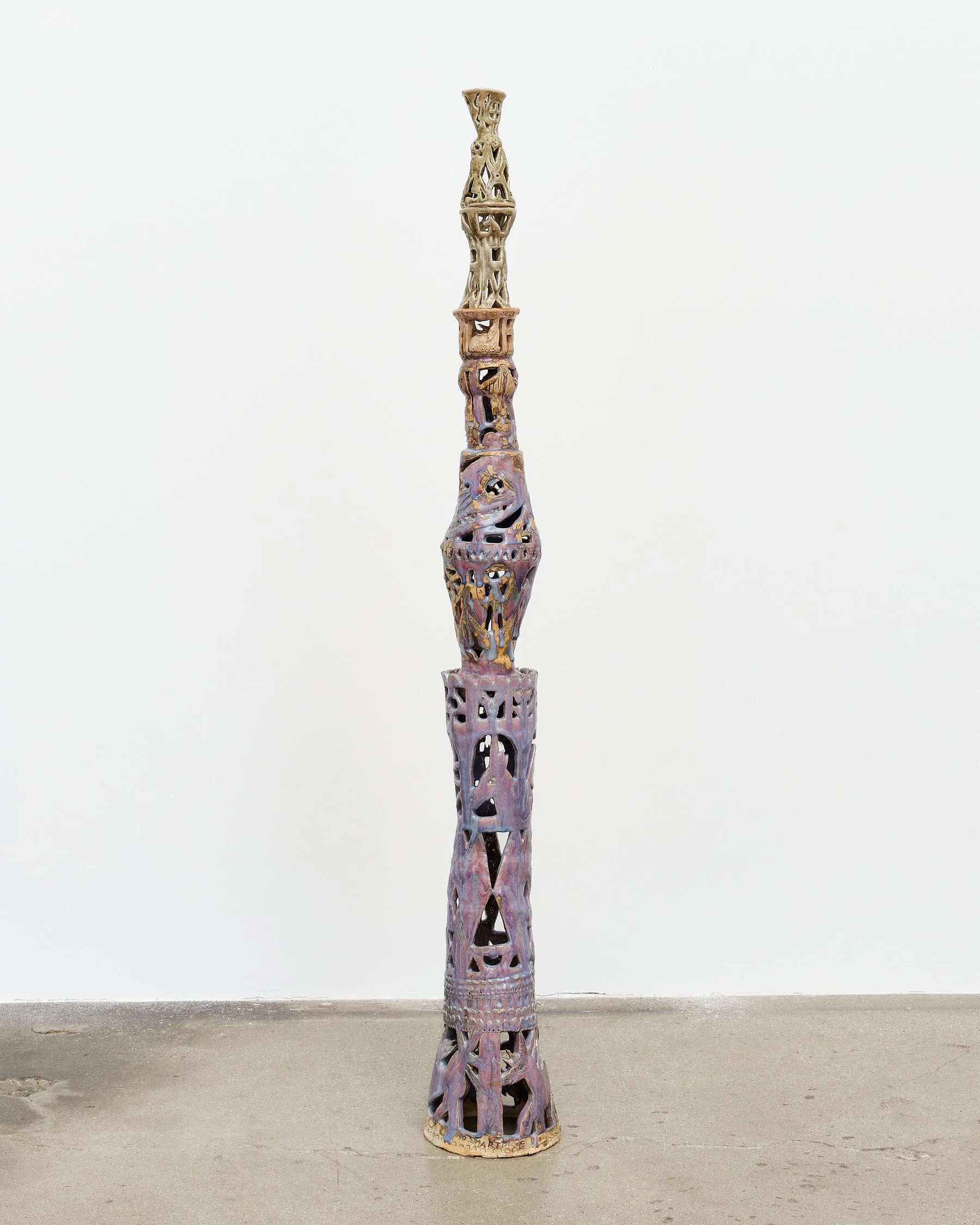 Allison Schulnik   Unicorn Window Tower  , 2024 Glazed ceramic, epoxy, acrylic paint, varnish 54.5 x 7 x 7" 138.43 x 17.78 x 17.78 cm