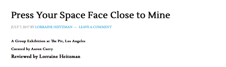 Lorraine Heitzman is an artist and writer living in Los Angeles. She has written about the local arts community for ArtCricketLA and Armseye Magazine and is currently a regular contributor to Art and Cake. In addition to exhibiting her art, Lorraine has her own blog, countingknuckles.com, and her art can be seen on her website lorraineheitzman.com