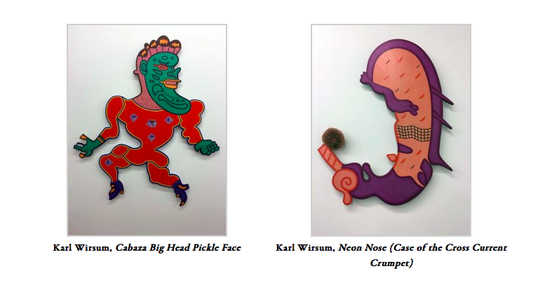 Some of the work at the Pit are from the artist’s collection, and one imagines that the others are firmly on his wish list. The figurative strain that runs through the show starts with the work of Karl Wirsum, who is famously associated with the Hairy Who, a group of Chicago artists who banded together in the late sixties in order to exhibit their work. Wirsum’s work is always fantastical and a little trippy. By his own admission he is indebted to outsider art, Art Brut and art from Mesoamerican and Japanese cultures, but his emphasis remains on color and shape, lending an iconic quality to his twisted characters. Though distorted through the lens of a fun house mirror, his subjects aren’t horrific; his paintings delight in the strength of their visual impact, combining and contrasting static tribal shapes with acid colors and complex, active lines. Wirsum’s 1991 Neon Nose (Case of the Cross Current Crumpet) and Cabaza Big Head Pickle Face from 2002 are prime examples of his isolated images, here on shaped wood. Despite their fastidious execution, Wirsum’s work never looks belabored. On display is his irreverent humor, imbuing his work with both a liveliness and charm that made Wirsum a valued teacher at The School of the Art Institute of Chicago as well as an esteemed artist.
