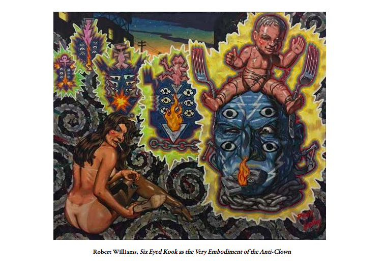Robert Williams is represented in the show by his painting Six Eyed Kook as the Very Embodiment of the Anti-Clown. Williams, who had his start working for Ed “Big Daddy” Roth, is a homegrown Southern California phenomenon. Revered by the underground comic crowd as well as by art collectors, his aggressive style of painting is as academic as it is cartoonish. His themes are perhaps darker than the other artists in Press Your Space Face Close To Mine, but he clearly belongs in the world that fuses pop culture and lowbrow art with fine art self-awareness. He can adeptly configure a crowd with the assurance of Reginald Marsh but imbues his quirky scenes with a menacing, leering realism more in keeping with Ivan Albright.