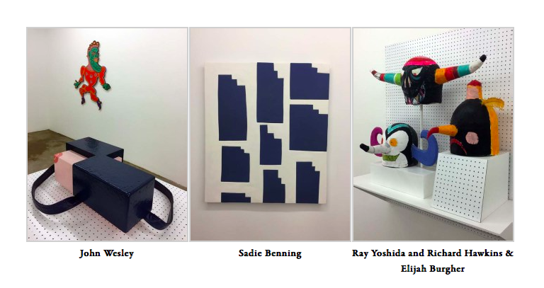 The remaining work in the show includes John Wesley, who has been active in painting in a pop art/minimalist vein since the sixties, Sadie Benning, whose minimalist painting fits squarely between Wesley’s work and the modular comic collages of Chicago Imagist, Richard Hawkins & Elijah Burgher’s collaborative paper-mache sculptures. Their three sculptures, SpermCult artifact:Culybator of Eunuchorns, SpermCult Artifact: NeverLand RanchHand and SpermCult Artifact: Adhedonicus Avuncularii, are curious artifacts, recalling masks from various cultures, imagery from the Southwest, the Pacific Northwest and Pacific Islanders and even ugly jugs from the Southeast. Straddling the bridge between found artifact and contemporary sculpture, they are perfectly realized, confident, imaginative work; kindred spirits to the caricatures and visages depicted by the Imagists or the masks worn by Mexican wrestlers.