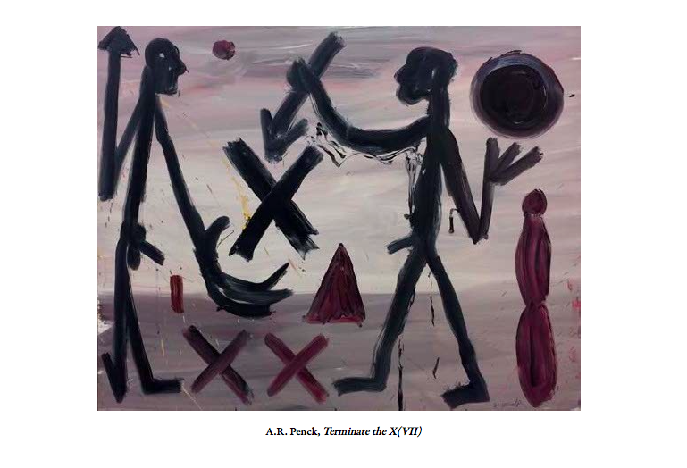 Curry, deeply connected with artist books as both a fan and publisher of Bad Dimension Press, shows Dieter Roth’s Collected Works, Volume 7: bok 3b and bok3d, a reconstruction of the books originally published by forlag ed in 1961. Under Plexiglas, the two visible pages reveal a dense picture book, an obsessive compilation of collaged images. Roth, originally from Switzerland, began his studies as a commercial designer but in short time began making and reconstructing books with found objects, initially combining text with food, which immediately established his reputation. A.R. Penck, a German artist, similarly began in the commercial arts and transitioned to fine art. Known for his primitive paintings that featured stick figures and graphic symbols, Penck’s works were deemed dissident and kept him under siege in East Germany, where the Stasi raided his studio. Upon leaving East Berlin, he flourished, continuing to paint in addition to drumming in a band throughout the eighties. He recently passed away, in May 2017.