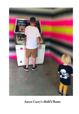 Lastly, Aaron Curry’s installation is a fantastical penny arcade that boasts a single beautifully restored mold machine in Mold’a’Rama. Set apart in a small space adjacent to the main galleries, Curry plastered the room with op art papers from floor to ceiling and placed the mold making jukebox of a machine directly front and center, as a kind of shrine to kitsch, toys, art and commodity. Tokens are available for purchase, which when deposited activates the vintage machine. Seconds later, a plastic sculpture designed by the artist is spit out, still warm from the process, a commentary perhaps about the transactional/commercial nature of a working artist.