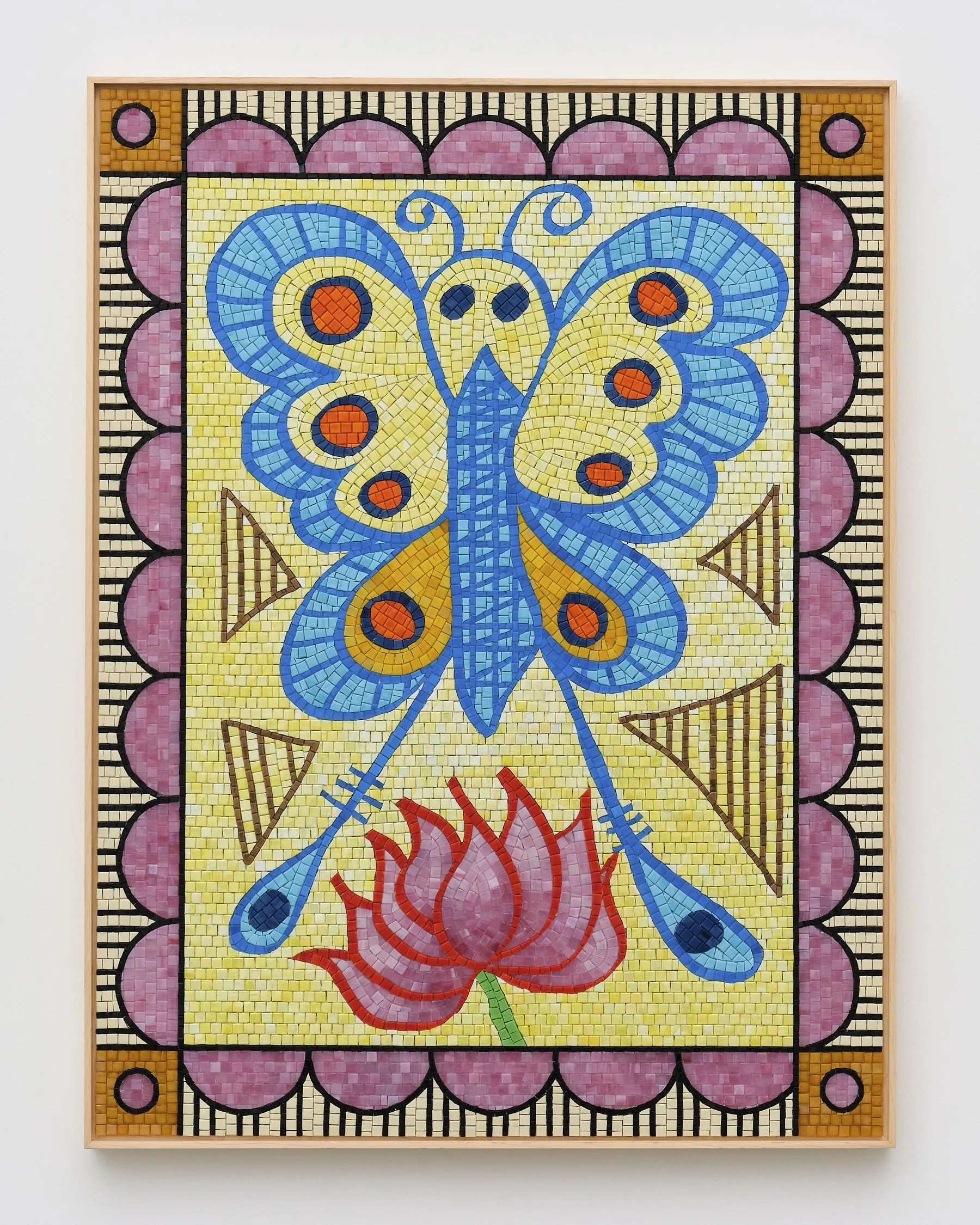 Tamara Gonzales, Butterfly With Lotus, 2026, Glass mosaic tile mounted on aluminum honeycomb board with maple frame, 40 x 30 in, 101.60 x 76.20 cm