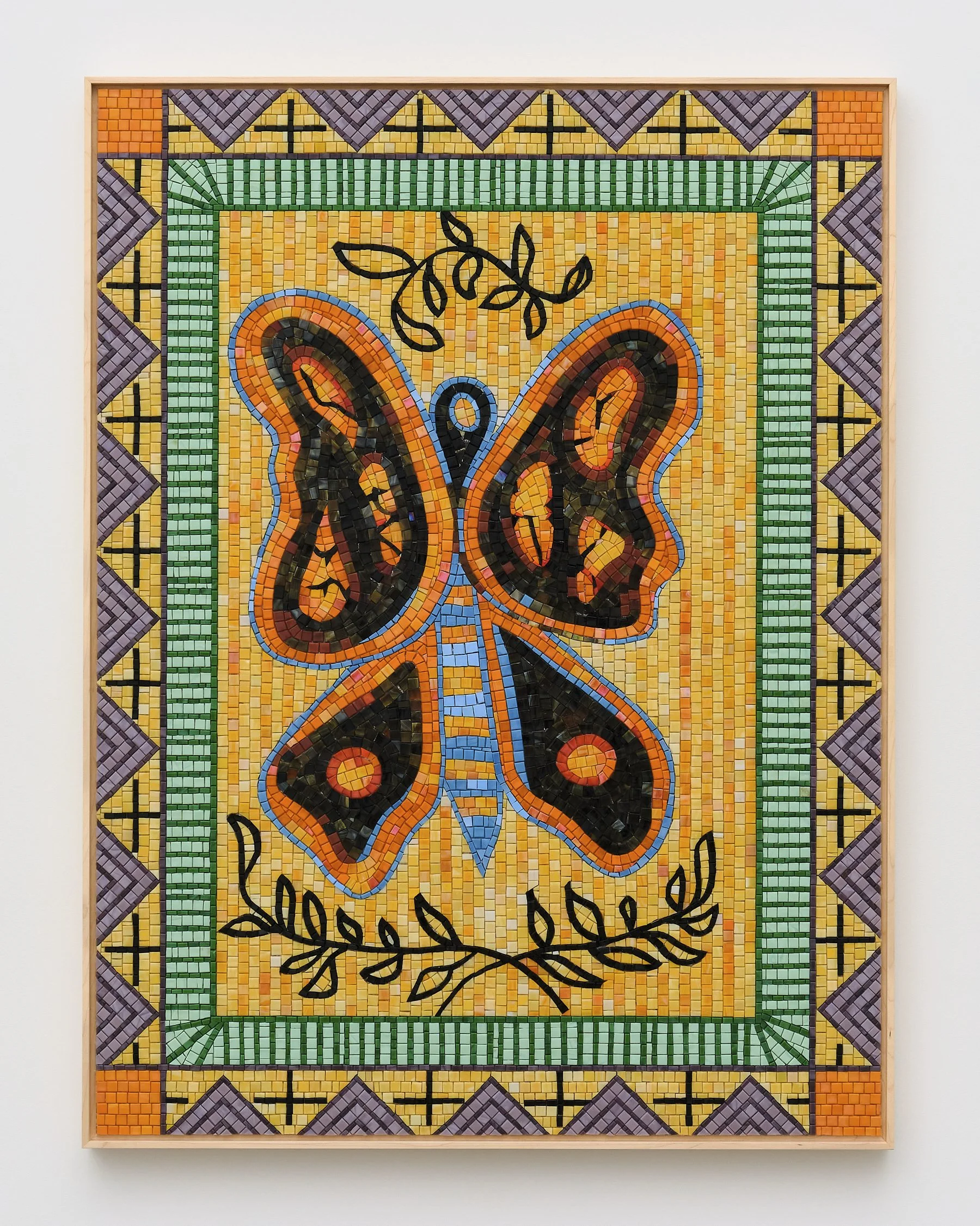 Tamara Gonzales, Monarch with Olive Branches, 2026, Glass mosaic tile mounted on aluminum honeycomb board with maple frame, 40 x 30 in, 101.60 x 76.20 cm