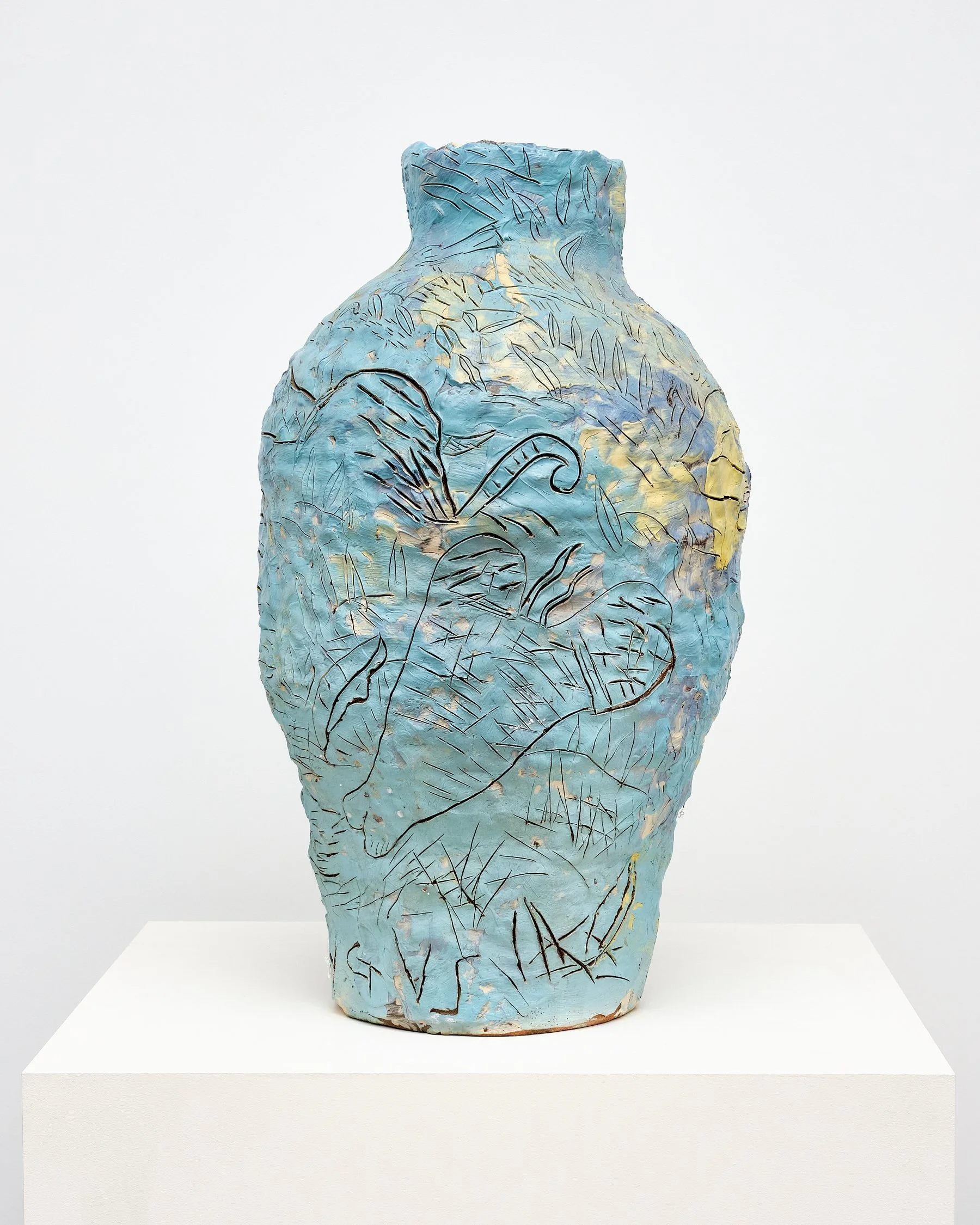 Kirk Mangus, Blue Nymph, 1986, Stoneware, coil built, colored engobes, sgraffito, 35 x 19 x 19 in, 88.90 x 48.26 x 48.26 cm