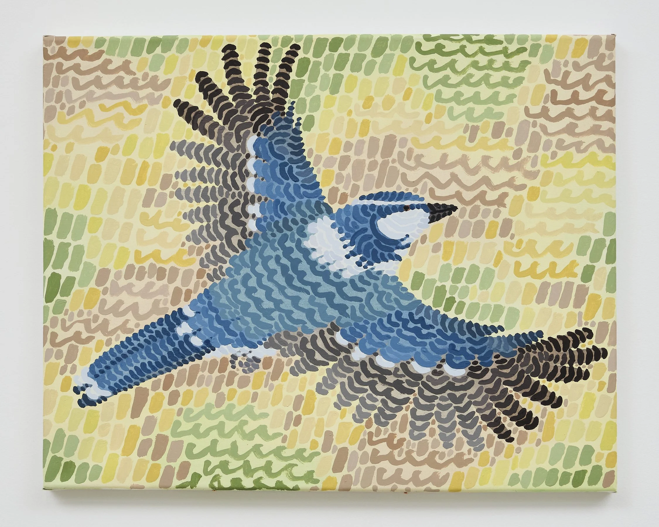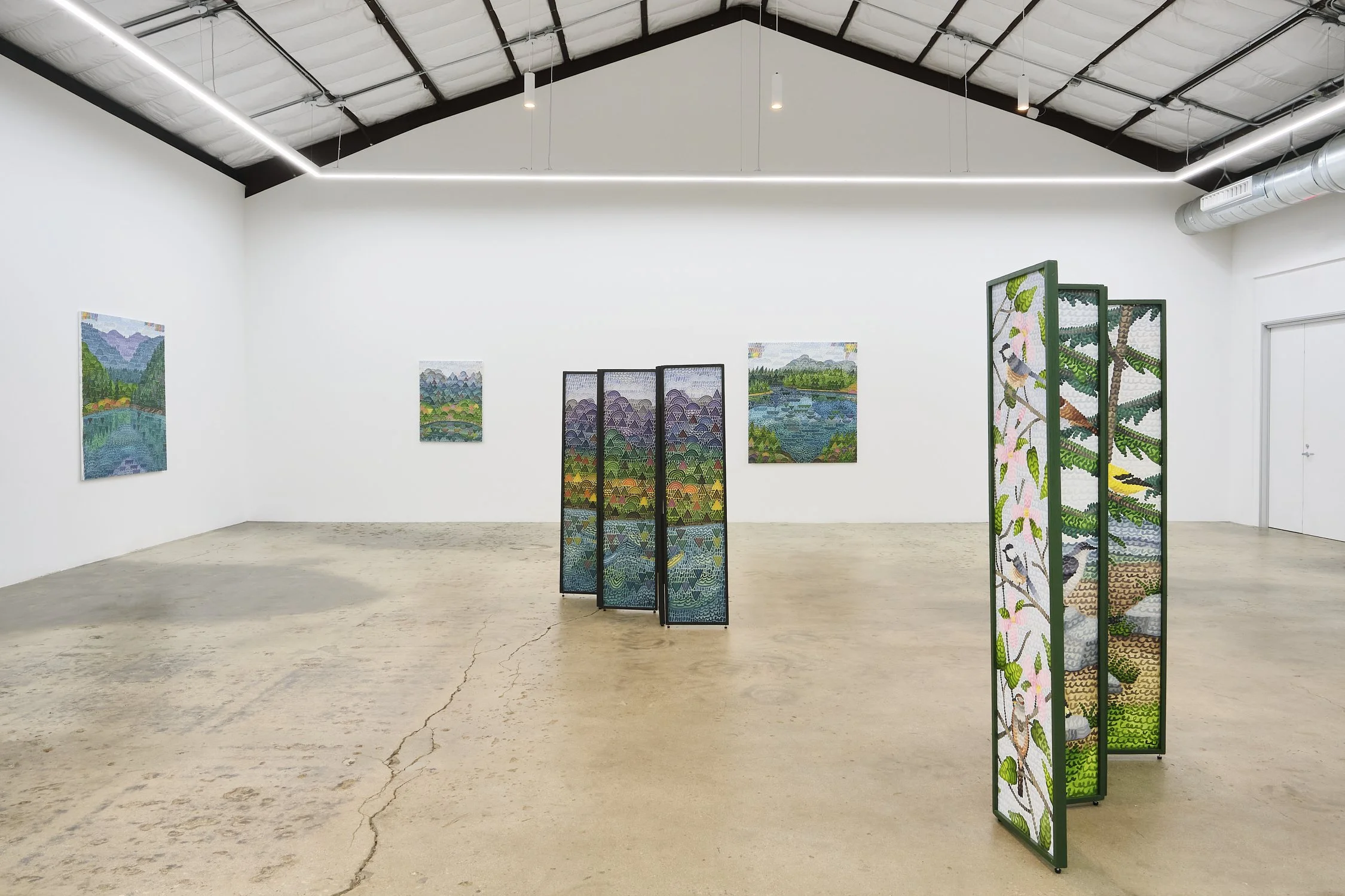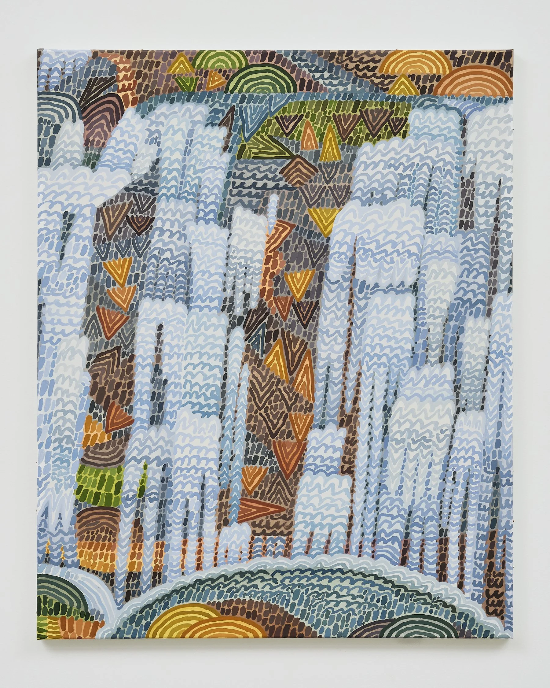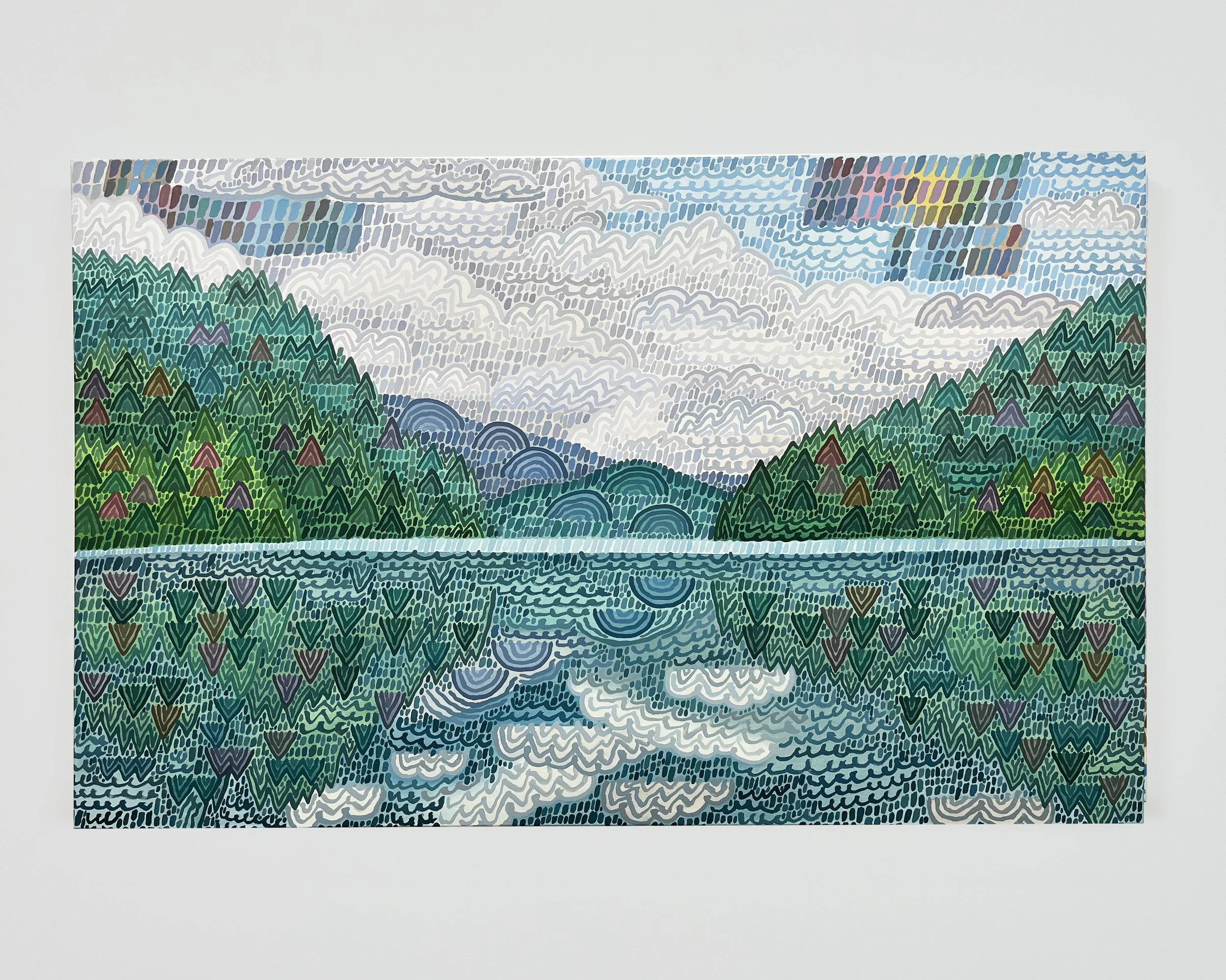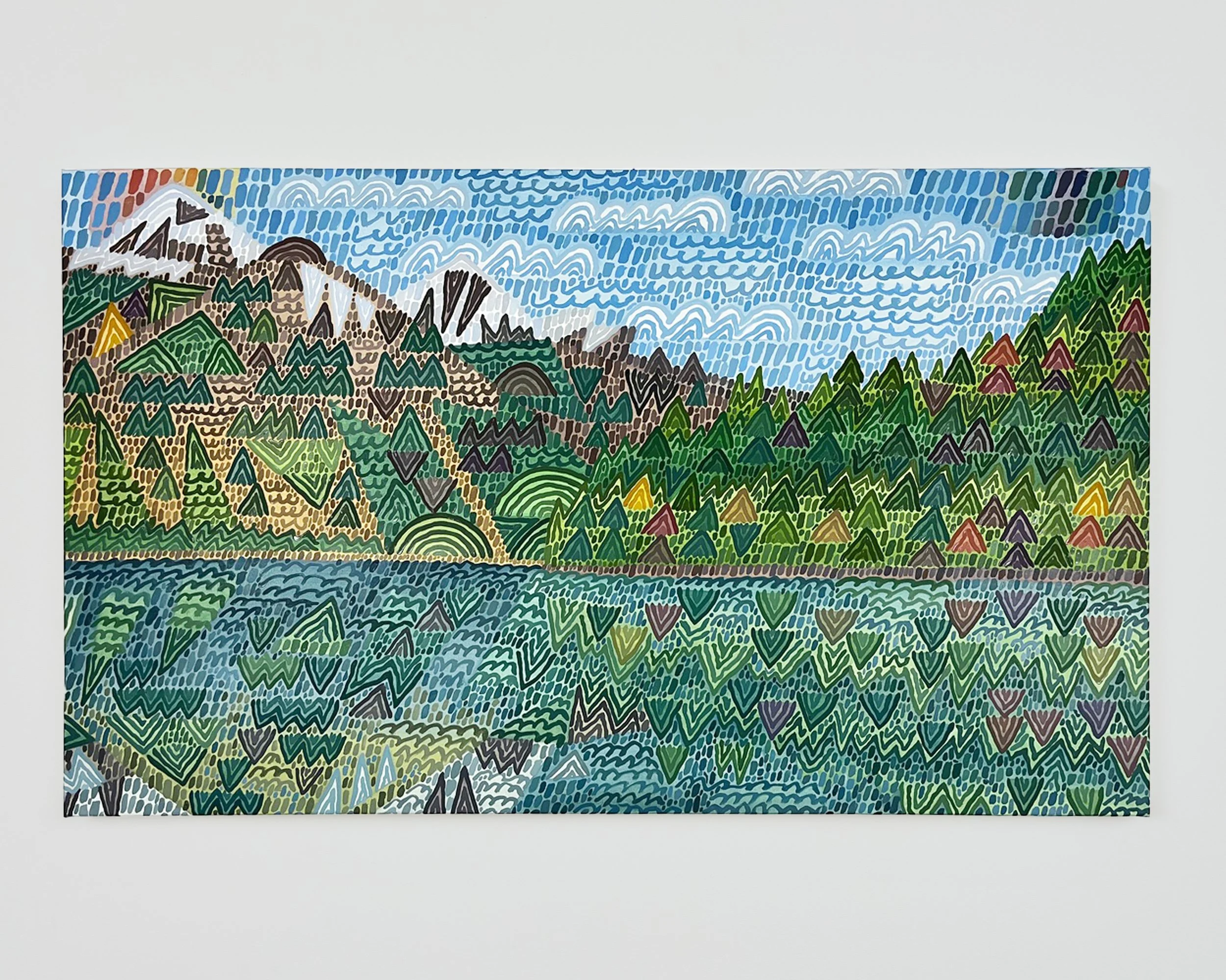 For To Be Grass Upon the Hills, Fonda turns his gaze toward landscapes as portals into broader states of contemplation. Fonda’s wavy brush strokes create triangular shapes that reference Plato’s fundamental building blocks of the universe and Buddhism’s three tenets (Impermanence, Unsatisfactoriness, and No-Self). The triangular shapes are paired with upside down crescents reminiscent of Buddhist stupas that act as both abstracted negative and positive spaces in the terrain. The paintings unfold in fields of color that blur the lines between representation and dream – trees radiate energy, skies hum with chromatic harmonies, and the ground seems to shift underfoot. The star of the exhibition is Lake Whatcom (Xwotʼqom) and Whatcom Falls in Washington state, a location dear to Fonda’s childhood, where his mother grew up, and where he sensed the awe of nature. Across the exhibition, nature becomes a mirror for consciousness by reflecting the interdependence, beauty, and impermanence that define the human condition. Through these new works, Fonda continues to pursue painting as an act of inquiry. For Fonda understanding the world begins with seeing it fully—each branch, each bird, each moment of light held briefly in paint.